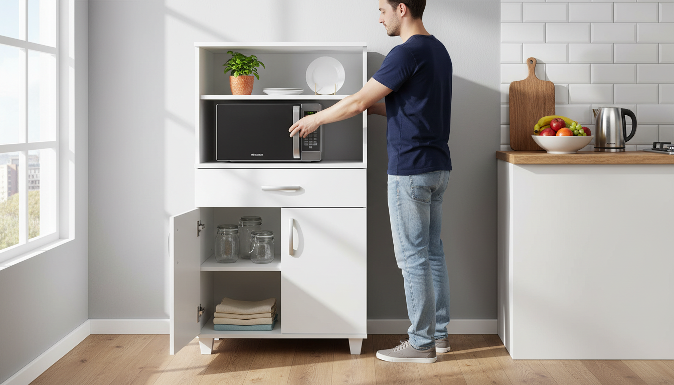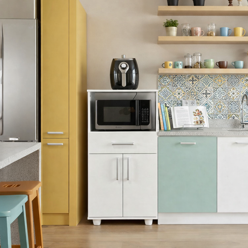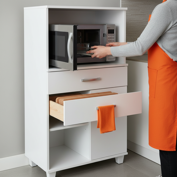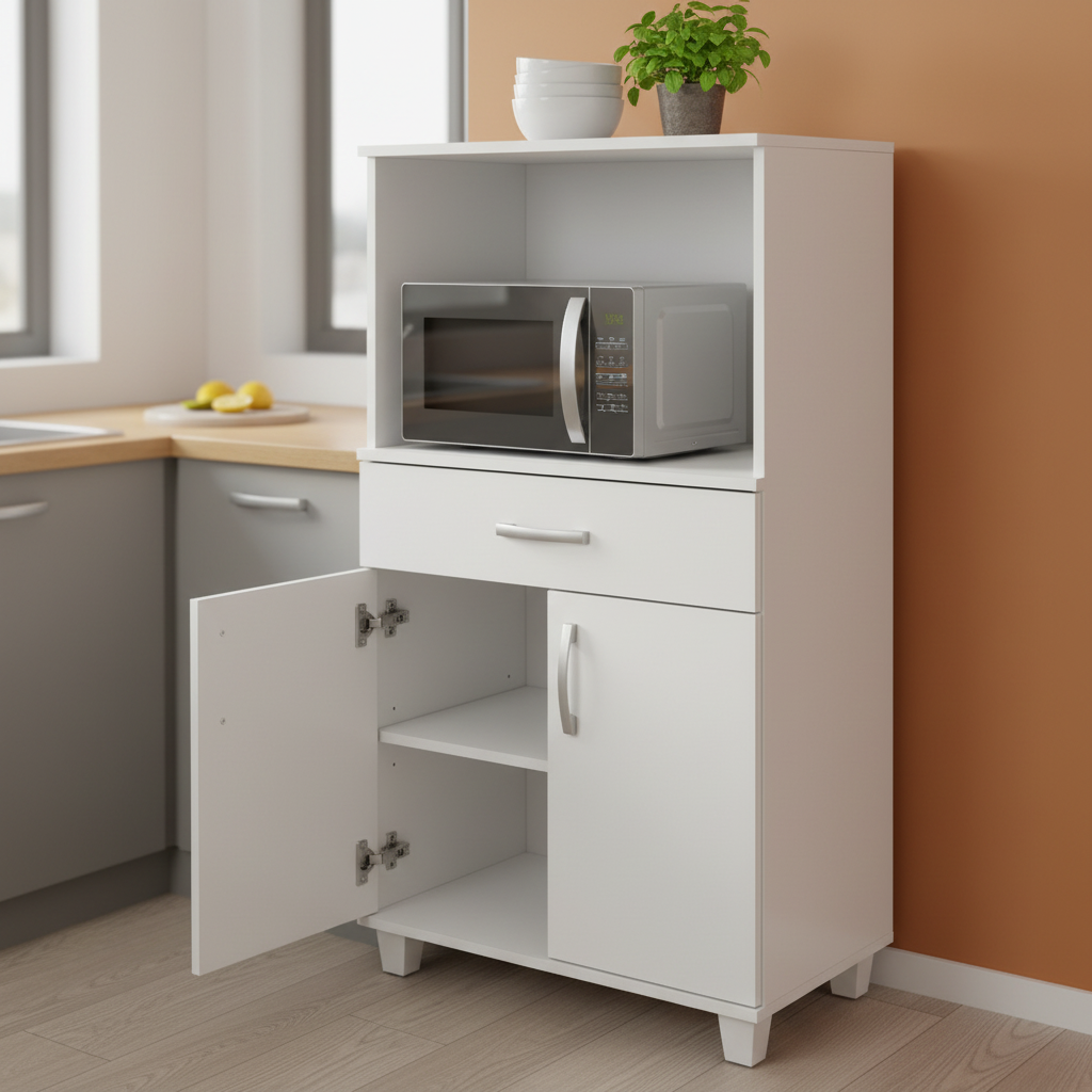 Espacio para microondas + espacio para horno eléctrico + alacena con puerta + cajón con correderas metálicas + pasacables integrado + herrajes y tornillería completa + instrucciones de armado.